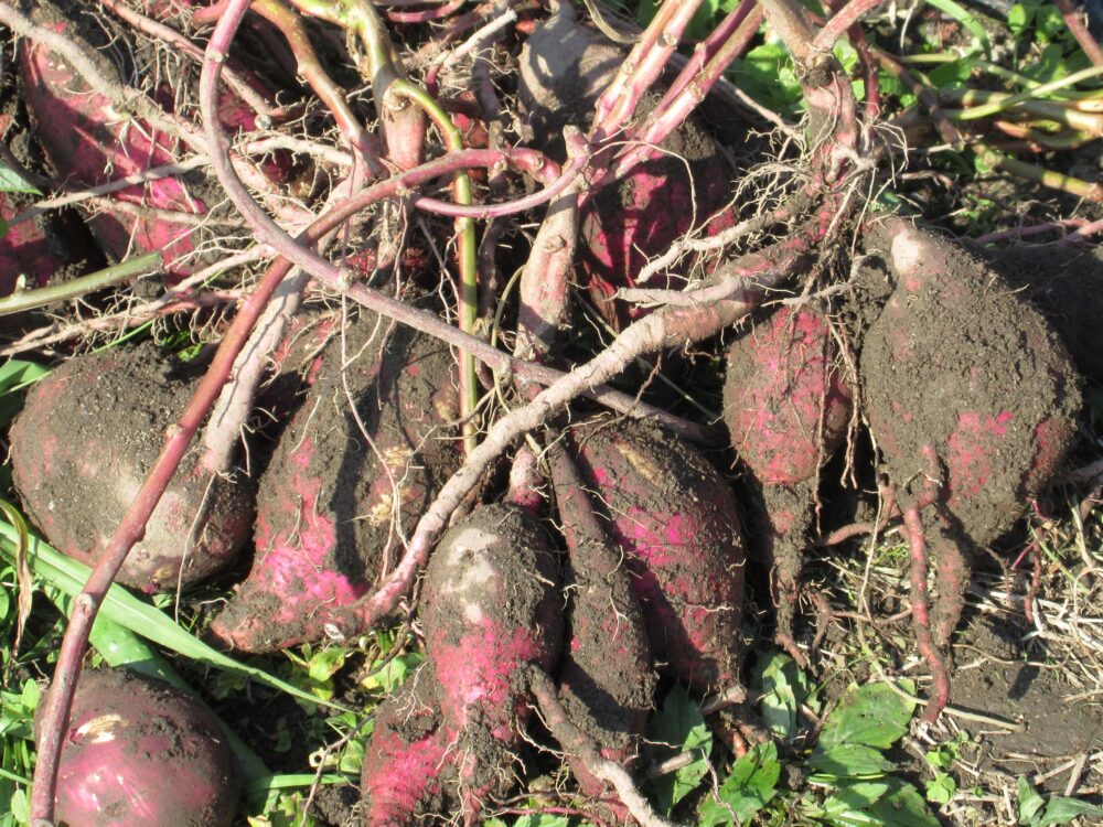 たくさんのいもの前で「ハイ、ポーズ!」