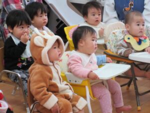 お題は「あわてんぼうのサンタクロース」みんな、真剣に見ています。